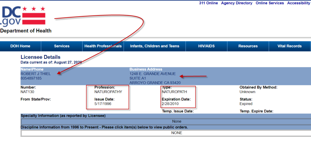 In all fairness, Bob told a truth somewhat, but let’s question the extent of that truthfulness. First of all, the issue date was in 1996 and this license expired February, 2010. That was over 10 years ago. I checked at https://www.webconfs.com/web-tools/domain-age-tool/ to see how old doctorsresearch website is. According to this website, it is 21 years and 7 months old as of this writing in (2019). The wayback machine shows that the “about” page where Thiel boasts of his qualifications has only existed since 2019. Investigating this, I see the page was added in early 2019. Either way, Bob decided to extend his qualifications after the expiration date. Is that a honest or open approach dealing with the health of the public? Does this behavior show honesty and integrity?