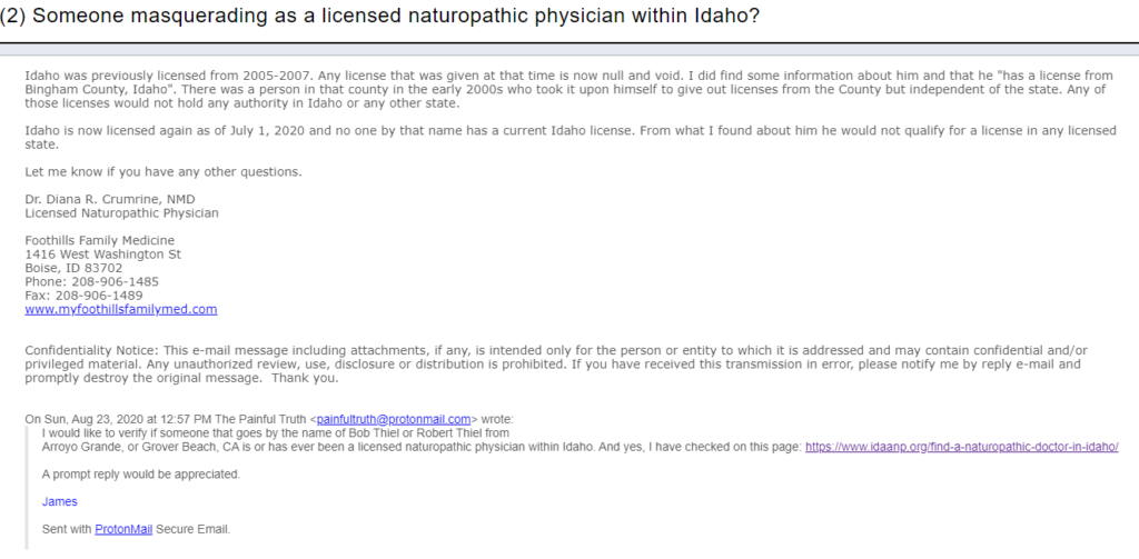 so I check this statement for its truthfulness. I wrote the DC Association of Naturopathic Physicians asking if there is any Bob or Robert Thiel registered within the district.