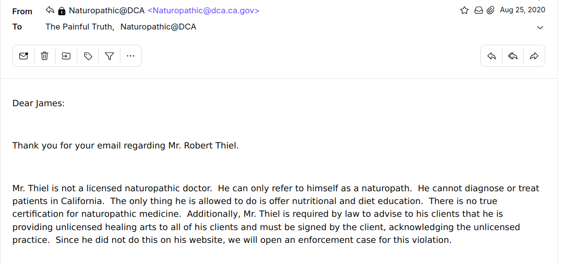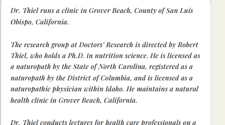 So why is it that Thiel states on both his websites: “licensed as a naturopath/scientist in Alabama.” ?